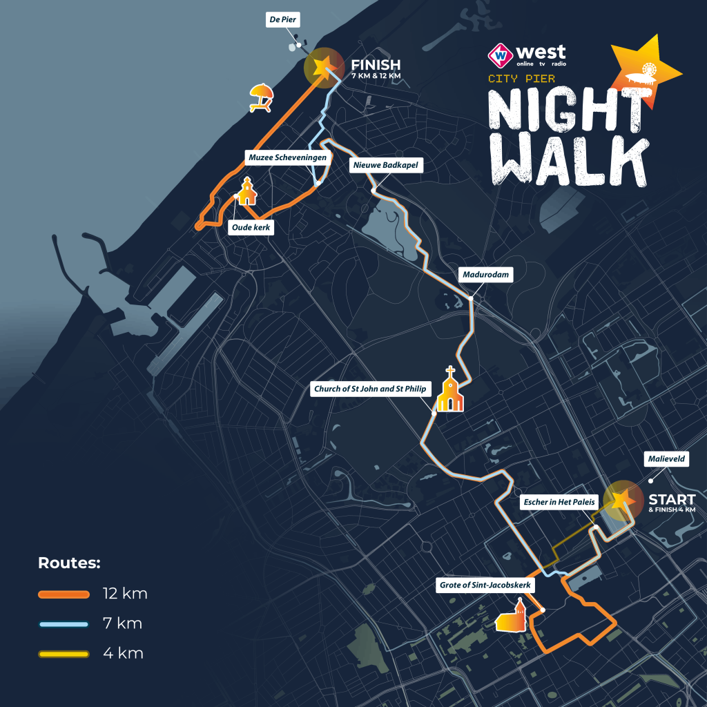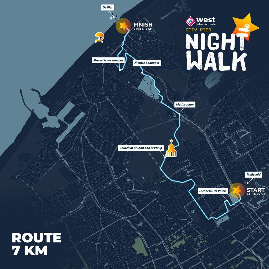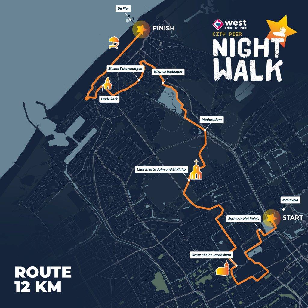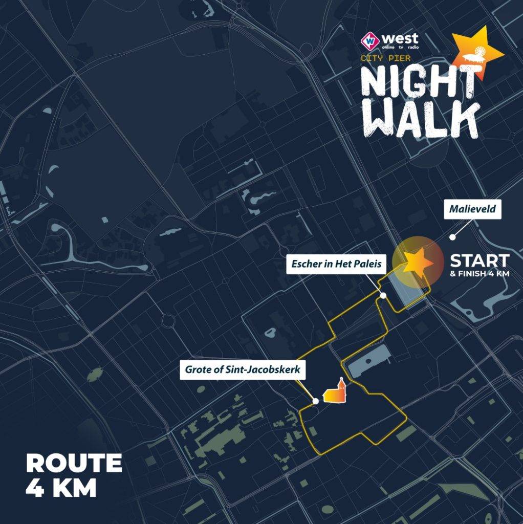 Bekijk hiernaast de kaart met de route voor de Omroep West City Pier Night Walk van 13 maart 2026!